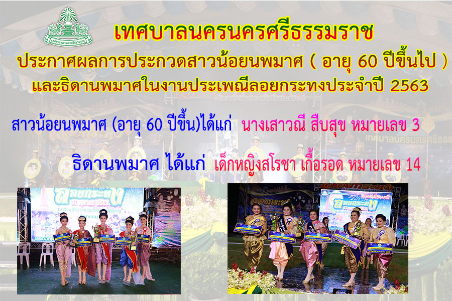 และ ผลการประกวดธิดานพมาศ ในงานประเพณีลอยกระทง ณ สวนสาธารณะศรีธรรมาโศกราช ตามรายละเอียดดังนี้ รางวัลชนะเลิศ ได้แก่ เด็กหญิงสโรชา เกื้อรอด หมายเลข 14 รับเงินสด 10,000 บาท พร้อมถ้วยรางวัลและสายสะพาย รางวัลรองชนะเลิศอันดับ 1 ได้แก่ เด็กหญิงภัทชลดา คงอ่อน หมายเลข 19 รับเงินสด 8,000 บาท พร้อมถ้วยรางวัลและสายสะพาย รางวัลรองชนะเลิศอันดับ 2 ได้แก่ เด็กหญิงปรายรัศมี แร้วกระโทก รับเงินสด 6,000 บาท พร้อมถ้วยรางวัลและสายสะพาย รางวัลชมเชย ได้แก่ เด็กหญิงสุพิชญา อุทัยรัตน์ หมายเลข 20 และ เด็กหญิงสลิสา เวฬุวนารักษ์ รับเงินสด 2,000 บาท