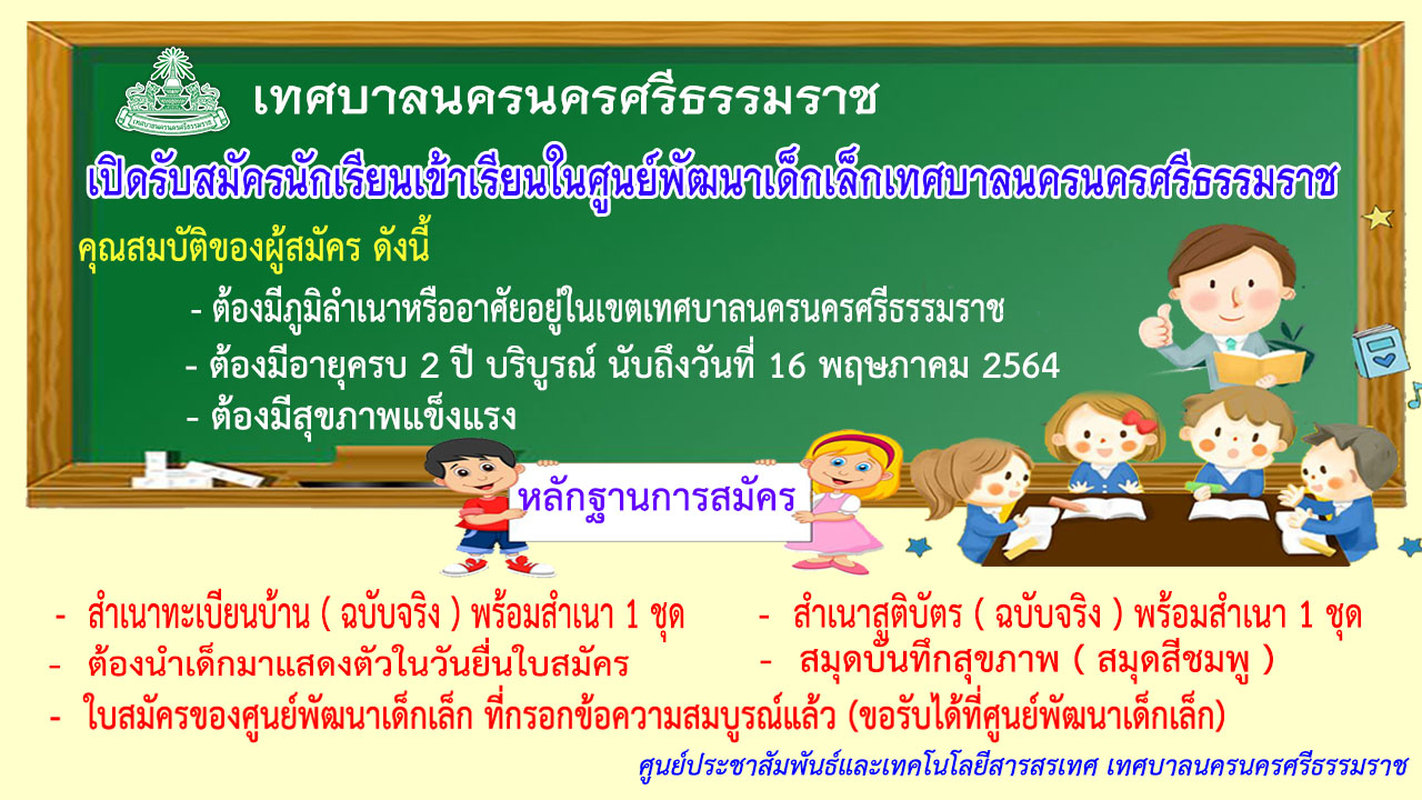 ศูนย์พัฒนาเด็กเล็กเทศบาลนครนครศรีธรรมราช เปิดรับสมัครนักเรียน ประจำปีการศึกษา 2564 |
