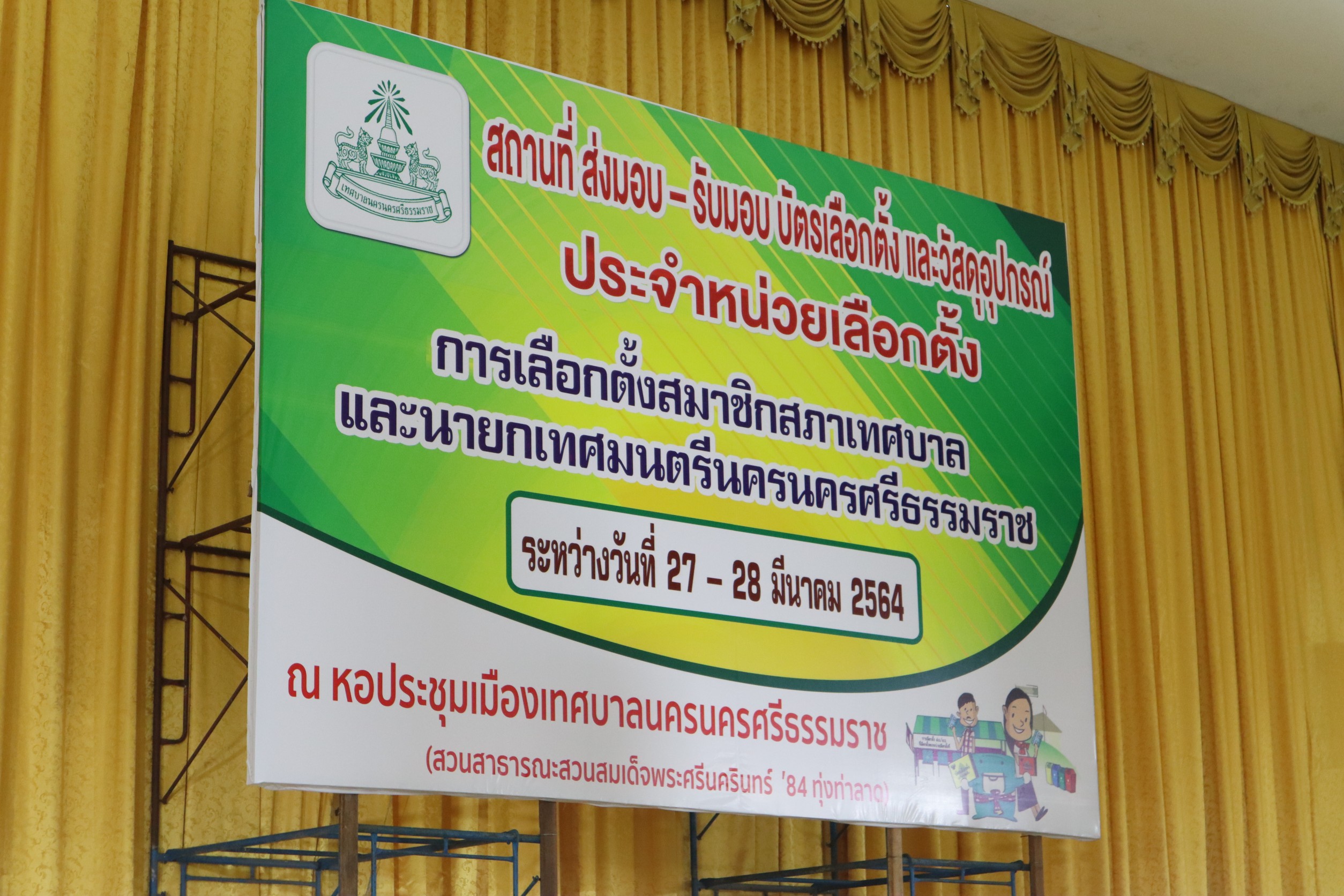 วันเสาร์ที่ 27 มีนาคม 2564 เวลา 09.00-12.00 น.เทศบาลนครนครศรีธรรมราช ภายใต้การนำของ นายชาคร ไอยศูรย์ปลัดเทศบาล ปฏิบัติหน้าที่นายกเทศมนตรีนครนครศรีธรรมราช และในตำแหน่งผู้อำนวยการการเลือกตั้งประจำเทศบาลนครนครศรีธรรมราช โดยศูนย์ประสานงานการเลือกตั้งประจำเทศบาลนครนครศรีธรรมราช ส่งมอบ บัตรเลือกตั้ง และวัสดุอุปกรณ์ ประจำหน่วยเลือกตั้ง ซึ่งในช่วงเช้า ดำเนินการส่งมอบจำนวน 2 เขตเลือกตั้ง ได้แก่เขตเลือกตั้งที่1 จำนวน 29 หน่วย และเขตเลือกตั้งที่2 จำนวน 30 หน่วย ณ หอประชุมเมืองเทศบาลนครนครศรีธรรมราช (สวนสมเด็จพระศรีนครินทร์ 84'ทุ่งท่าลาด) เป็นไปด้วยความเรียบร้อย