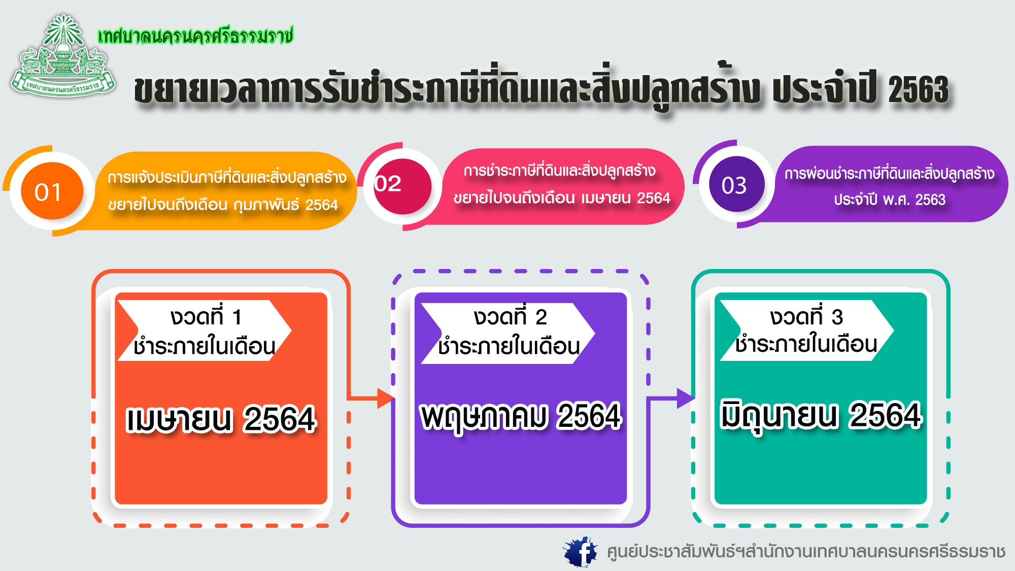 เทศบาลนครนครศรีธรรมราช ประกาศขยายเวลาการชำระภาษีที่ดินและสิ่งปลูกสร้าง ประจำปี พ.ศ. 2563 |