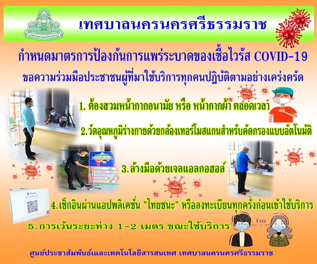 เทศบาลนครนครศรีธรรมราช กำหนดมาตรการป้องกันการแพร่ระบาดของเชื้อไวรัส COVID-19 โดยขอความร่วมมือประชาชนผู้ที่มาใช้บริการทุกคนปฎิบัติตามอย่างเคร่งครัด |