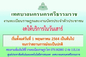 เทศบาลนครนครศรีธรรมราช โดยงานทะเบียนราษฎรและงานบัตรประจำตัวประชาชน สำนักปลัดเทศบาล งดให้บริการในวันเสาร์ โดยเริ่มตั้งแต่วันเสาร์ 1 พฤษภาคม 2564 |