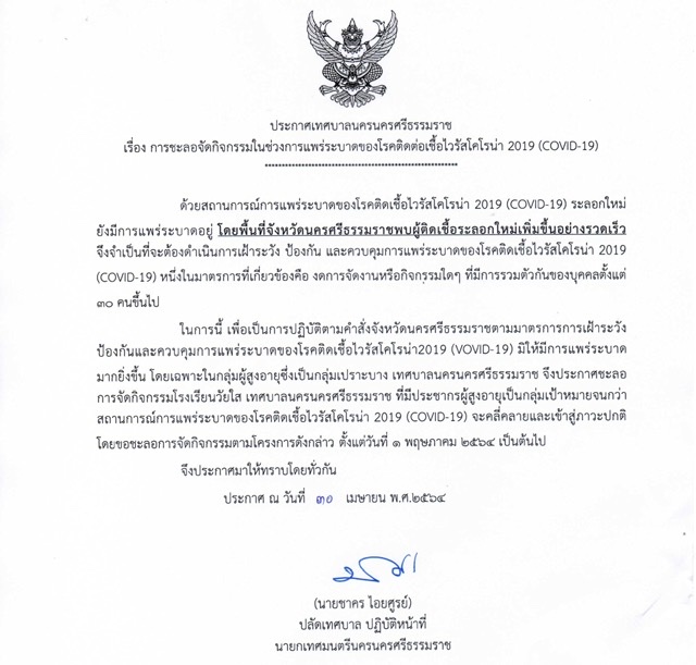 เทศบาลนครนครศรีธรรมราช ภายใต้การนำของ นายชาคร ไอยศูรย์ ปลัดเทศบาล ปฏิบัติหน้าที่นายกเทศมนตรีนครนครศรีธรรมราช โดยกองสวัสดิการสังคม เทศบาลนครนครศรีธรรมราช ชะลอการจัดกิจกรรมโรงเรียนวัยใส เทศบาลนครนครศรีธรรมราช ตั้งแต่วันที่ 1 พฤษภาคม 2564 จนกว่าสถานการณ์การแพร่ระบาดของโรคติดเชื้อไวรัสโคโรนา 2019 (COVID-19) จะคลี่คลายและเข้าสู่สภาวะปกติ ข่าว/แสงจันทร์ |