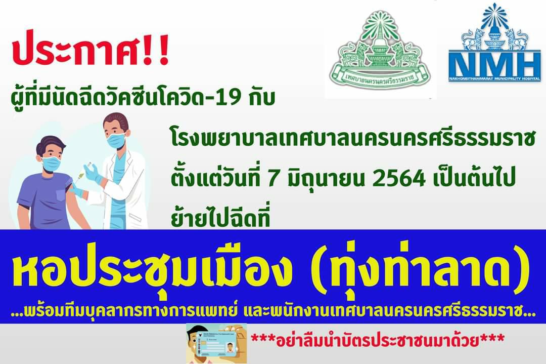 เทศบาลนครนครศรีธรรมราช แจ้งสถานที่ฉีดวัคซีนโควิด-19 สำหรับ ประชาชนผู้ลงทะเบียนฉีดวัคซีน กับโรงพยาบาลเทศบาลนครนครศรีธรรมราช ให้ไปฉีดวัคซีน ณ หอประชุมเมืองเทศบาลนครนครศรีธรรมราช (ทุ่งท่าลาด) ตามวัน-เวลา ที่ท่านได้ลงทะเบียนไว้ |
