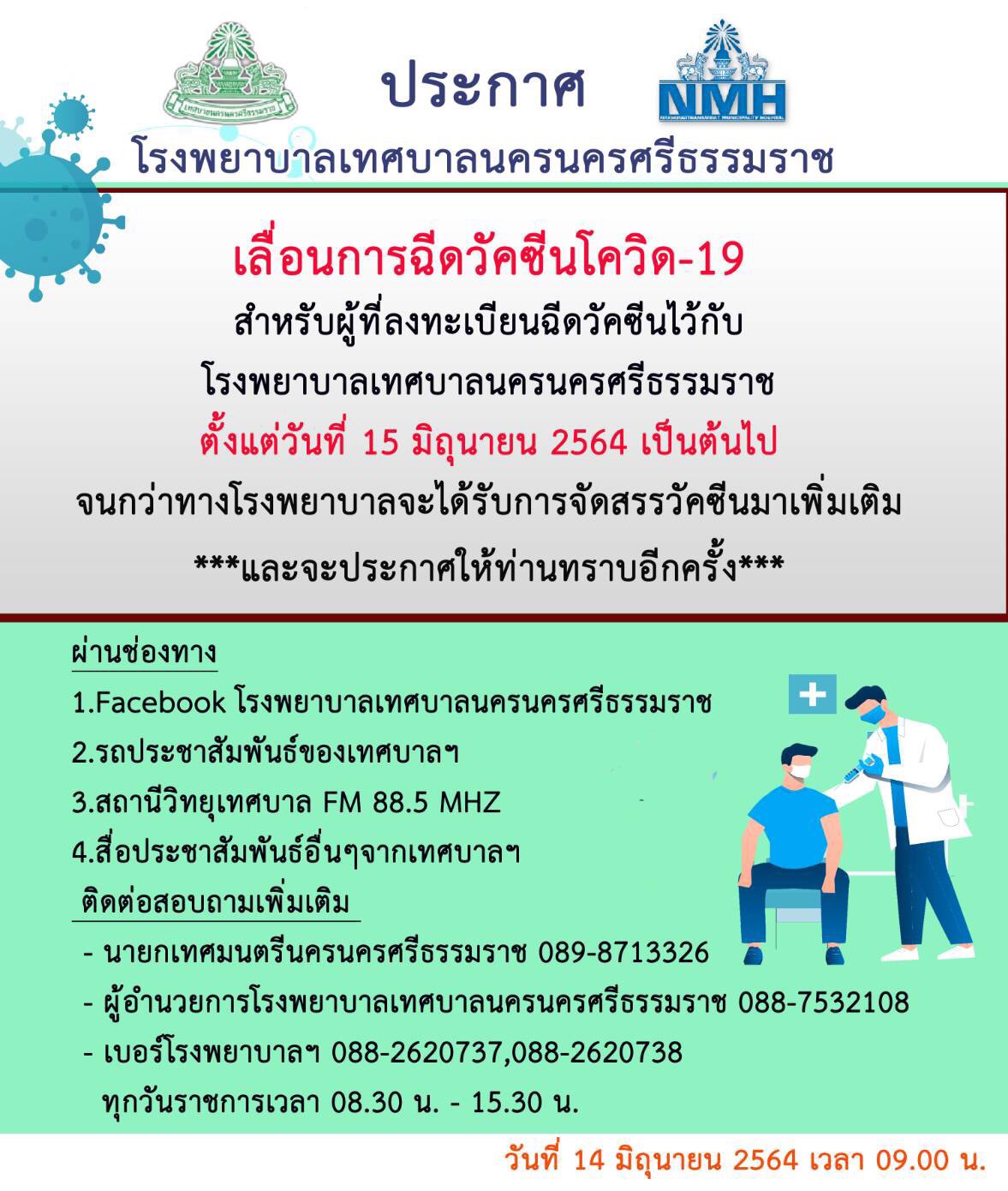 โรงพยาบาลเทศบาลนครนครศรีธรรมราช แจ้งเลื่อนการฉีดวัคซีนโควิด-19 สำหรับผู้ที่ลงทะเบียนฉีดวัคซีนไว้กับโรงพยาบาลเทศบาลนครนครศรีธรรมราช ตั้งแต่วันที่ 15 มิถุนายน 2564 เป็นต้นไป จนกว่าทางโรงพยาบาลจะได้รับการจัดสรรวัคซีนมาเพิ่ม |