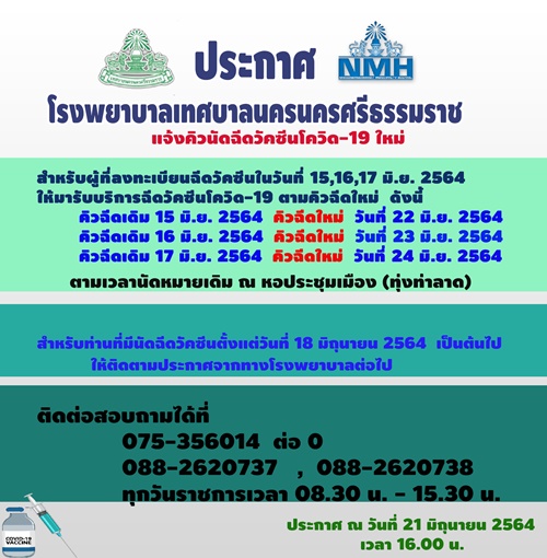 ประกาศโรงพยาบาลเทศบาลนครนครศรีธรรมราช แจ้งคิวนัดฉีดวัคซีนโควิด-19 ใหม่ |