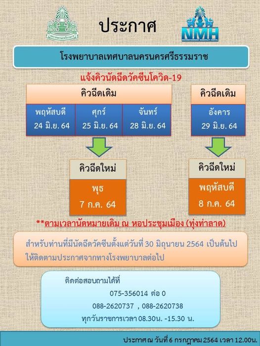 ประกาศโรงพยาบาลเทศบาลนครนครศรีธรรมราช แจ้งคิวนัดฉีดวัคซีนโควิด-19 |