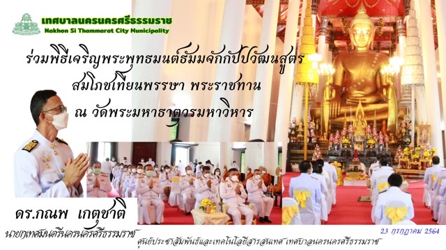 ดร.กณพ เกตุชาติ นายกเทศมนตรีนครนครศรีธรรมราช ร่วมพิธีเจริญพระพุทธมนต์ธัมมจักกัปปวัตนสูตร สมโภชเทียนพรรษาพระราชทาน และพิธีถวายเทียนพรรษาพระราชทาน เนื่องในเทศกาลวันอาสาฬหบูชา-เข้าพรรษา ประจำปี 2564 |
