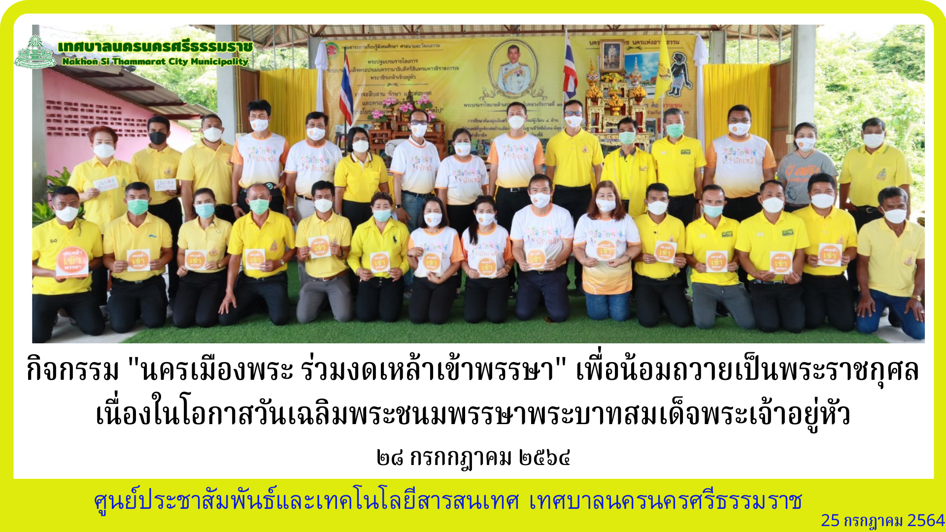 ดร.กณพ เกตุชาติ นายกเทศมนตรีนครนครศรีธรรมราช ร่วมพิธีเปิดกิจกรรม " นครเมืองพระ ร่วมงดเหล้าเข้าพรรษา " เพื่อน้อมถวายเป็นพระราชกุศล เนื่องในโอกาสวันเฉลิมพระชนมพรรษาพระบาทสมเด็จพระเจ้าอยู่หัว 28 กรกฎาคม 2564 |