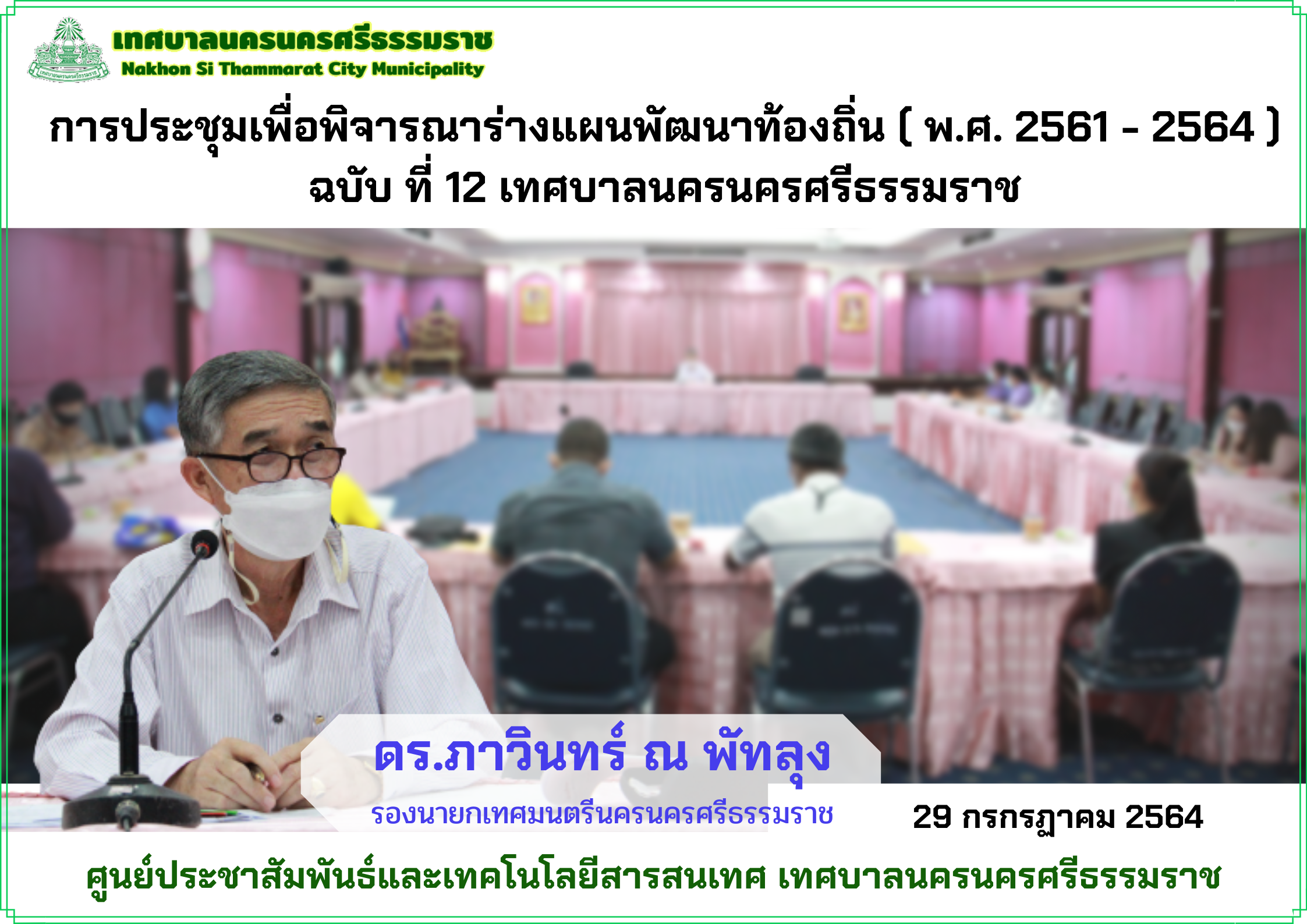 ดร.ภาวินทร์ ณ พัทลุง รองนายกเทศมนตรีนครนครศรีธรรมราช เป็นประธานการประชุม เพื่อพิจารณาร่างแผนพัฒนาท้องถิ่น ( พ.ศ. 2561 – พ.ศ.2565 ) |