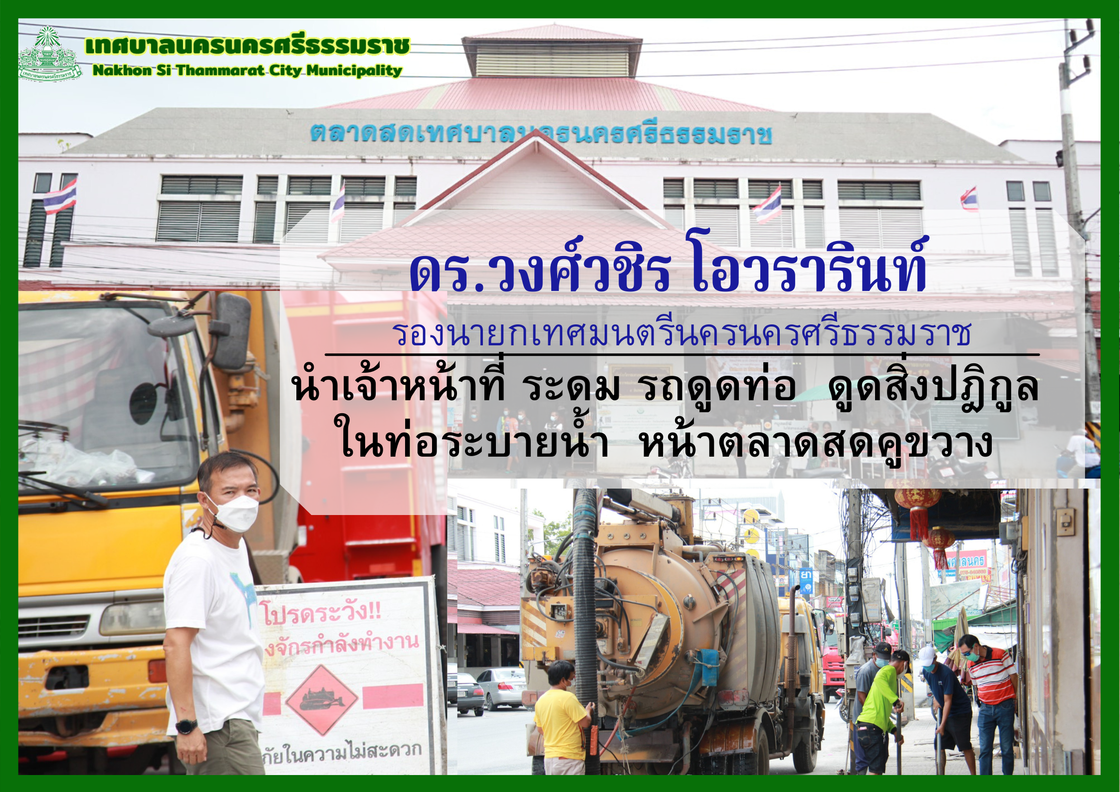 ดร.วงศ์วชิร โอวรารินท์ รองนายกเทศมนตรีนครนครศรีธรรมราช ระดมรถดูดท่อ ฉีดล้างท่อระบายน้ำ และดูดสิ่งปฎิกูล ภายในท่อระบายน้ำ |
