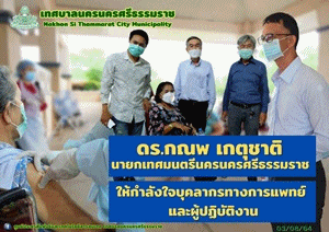 วันอังคาร ที่ 3 สิงหาคม 2564 เวลา 15.00 น. ดร.กณพ เกตุชาติ นายกเทศมนตรีนครนครศรีธรรมราช พร้อมด้วย ดร.ภาวินทร์ ณ พัทลุง รองนายกเทศมนตรีฯ และสมาชิกสภาเทศบาล เขต3 ลงพื้นที่ให้กำลังใจบุคลากรทางการแพทย์ และเจ้าหน้าที่ผู้ปฏิบัติงาน ศูนย์บริการฉีดวัคซีนโควิด-19 ณ หอประชุมเมืองนครศรีธรรมราช |