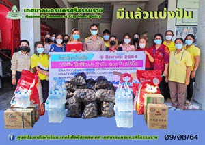 วันจันทร์ ที่9 สิงหาคม 2564 ดร.กณพ เกตุชาติ นายกเทศมนตรีนครนครศรีธรรมราช พร้อมด้วยผู้บริหาร หัวหน้าส่วนราชการ รับมอบเครื่องบริโภค ข้าวสาร น้ำดื่ม และมังคุด จาก บริษัท ฮันนัน 99 จำกัด และ ร้านป้าโส เพื่อนำไปแจกจ่ายให้แก่ชาวบ้าน ช่วยเหลือผู้ได้รับผลกระทบจากพิษโควิด -19 ตามโครงการจิตอาสา ทำความดี มีแล้วแบ่งปัน |