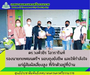 รองนายกเทศมนตรีนครนครศรีธรรมราช ลงพื้นที่มอบถุงยังชีพ และให้กำลังใจ แก่ผู้สัมผัสเสี่ยงสูงที่กักตัวอยู่ที่บ้านตามคำสั่งคณะกรรมการควบคุมโรคจังหวัดนครศรีธรรมราช |