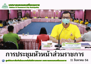 วันพุธที่ 11 สิงหาคม 2564 เวลา 10.00 น. ณ ห้องประชุมชั้น 5 เทศบาลนครนครศรีธรรมราช ดร.กณพ เกตุชาติ นายกเทศมนตรีนครนครศรีธรรมราช เป็นประธานการประชุมผู้บริหารเทศบาล หัวหน้าส่วนราชการ และผู้บริหารสถานศึกษาโรงเรียนในสังกัดเทศบาลครั้งที่4/2564 โดยมีเรื่องที่ประธานแจ้งให้ทราบ -เรื่องการสนับสนุนโรงพยาบาลสนามอุ่นไอรัก ปากนคร -เรื่องมาตรการควบคุมโควิด ตลาดคูขวาง -เรื่องการลงทะเบียนและวันนัดฉีดวัคซีนตัวเลือก -เรื่องการประชุมสภาเทศบาล วันที่ 13 สิงหาคม 2564 และเรื่องรับรองรายงานการประชุมสภาเทศบาล วันที่ 13 สิงหาคม 2564 พร้อมทั้งติดตามผลการปฎิบัติงานของ สำนัก กอง ฝ่าย ทั้งนี้ นายกเทศมนตรีเน้นย้ำให้ทุกสำนัก/กอง ปฏิบัติงาน เพื่อให้เกิดประโยชน์กับประชาชนในพื้นที่เขตเทศบาลนครนครศรีธรรมราช