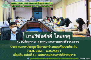 นายวิชัยศักดิ์ ไสยเกตุ รองปลัดเทศบาล เทศบาลนครนครศรีธรรมราช เป็นประธานการประชุม พิจารณาร่างแผนพัฒนาท้องถิ่น ( พ.ศ. 2561 – พ.ศ.2565 ) เพิ่มเติม ฉบับที่ 13 เทศบาลนครนครศรีธรรมราช |