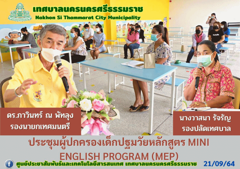 ดร.ภาวินทร์ ณ พัทลุง รองนายกเทศมนตรีนครนครศรีธรรมราช ประธานการประชุมผู้ปกครองเด็กปฐมวัยหลักสูตร MINI ENGLISH PROGRAM (MEP) ครั้งที่1/2564 ภาคเรียนที่1/2564 |