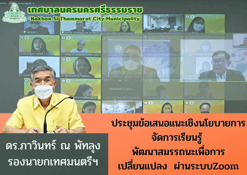 ดร.ภาวินทร์ ณ พัทลุง รองนายกเทศมนตรีนครนครศรีธรรมราช ร่วมประชุมจัดทำข้อเสนอแนะเชิงนโยบายการจัดการเรียนรู้พัฒนาสมรรถนะเพื่อการเปลี่ยนแปลง ผ่านระบบZOOM |