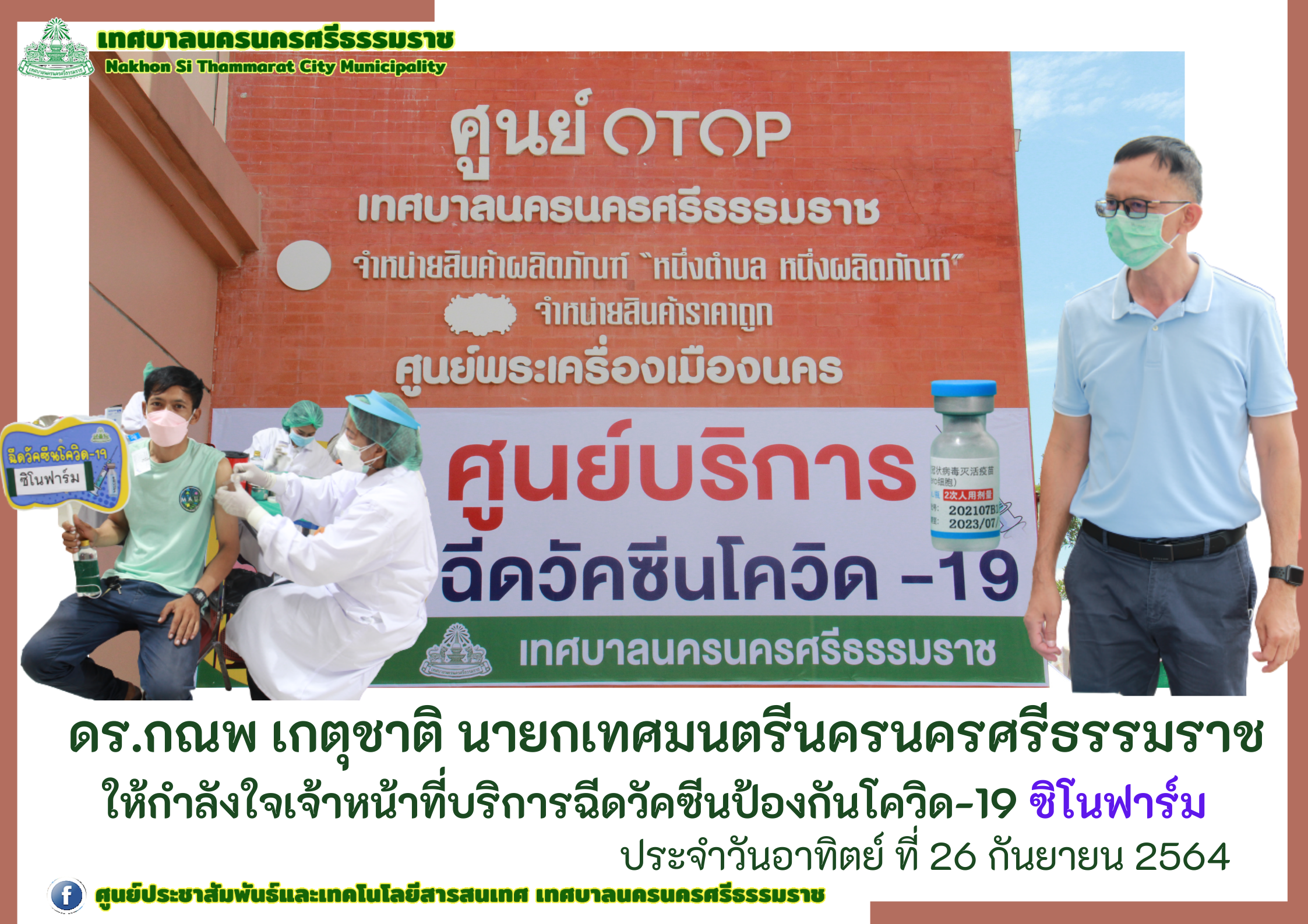 เทศบาลนครนครศรีธรรมราช ให้บริการฉีดวัคซีนป้องกันโรคโควิด-19 ประจำวันอาทิตย์ ที่ 26 กันยายน 2564 วันอาทิตย์ ที่ 26 กันยายน พ.ศ. 2564 ตั้งแต่เวลา 08.30 -16.00 น. ณ ศูนย์โอทอป สวนสาธารณะศรีธรรมาโศกราช ดร.กณพ เกตุชาติ นายกเทศมนตรีนครนครศรีธรรมราช พร้อมด้วย สมาชิกสภาเทศบาลนครนครศรีธรรมราช ลงพื้นที่ ให้กำลังใจเจ้าหน้าที่ ผู้ปฏิบัติงาน บริการฉีดวัคซีนป้องกันโรคโควิด-19 สำหรับผู้ฉีดวัคซีน Sinopharm จำนวน 777 คน ตามที่ประกาศทางเว็ปไซต์เทศบาล |