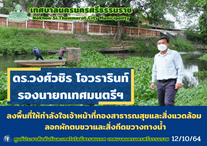 ดร.วงศ์วชิร โอวรารินท์ รองนายกเทศมนตรีนครนครศรีธรรมราช ลงพื้นที่ด่วนในการลอกผักตบชวาและสิ่งกีดขวางทางน้ำ |