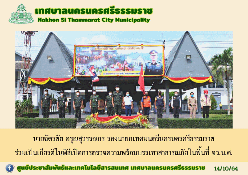 วันพฤหัสบดี ที่14 ตุลาคม 2564 เวลา 10.30 น. นายฉัตรชัย อรุณสุวรรณกร รองนายกเทศมนตรีนครนครศรีธรรมราช ร่วมเป็นเกียรติในพิธีเปิดการตรวจความพร้อมบรรเทาสาธารณภัยในพื้นที่จังหวัดนครศรีธรรมราช ณ สนามบิน ทภ.๔ ค่ายวชิราวุธ จังหวัดนครศรีธรรมราช สำหรับศูนย์บรรเทาสาธารณภัยมณฑลทหารบกที่ 41 มีหน่วยบรรเทาสาธารณภัยในความรับผิดชอบ จำนวน 8 หน่วย 23 อำเภอ ของจังหวัดนครศรีธรรมราช |