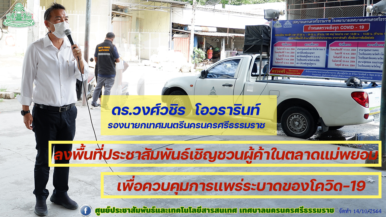 วันพฤหัสบดีที่ 14 ตุลาคม 2564 เวลา 10.00 น. ณ ตลาดกลางการเกษตรหัวอิฐ (ตลาดแม่พยอม) ดร.กณพ เกตุชาติ นายกเทศมนตรีนครนครศรีธรรมราช มอบหมายให้ ดร.วงศ์วชิร โอวรารินท์ รองนายกเทศมนตรีนครนครศรีธรรมราช พร้อมด้วยเจ้าหน้าที่กองสาธารณสุขและสิ่งแวดล้อม ลงพื้นที่ เพื่อสอบโรคในพื้นที่เสี่ยงต่อการติดเชื้อในตลาดแม่พยอม และประชาสัมพันธ์เข้ารับการตรวจหาเชื้อโควิด-19 เพื่อควบคุมการแพร่ระบาดของโรคในกลุ่มผู้ประกอบการ และพื้นที่โดยรอบ