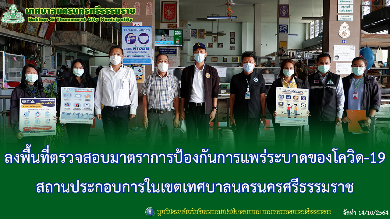 วันพฤหัสบดีที่ 14 ตุลาคม 2564 เวลา 10.30 น. ณ สถานประกอบการนครทวดทองคอนกรีต นายวิทยา เขียวรอด นายอำเภอเมืองนครศรีธรรมราชพร พร้อมด้วย ดร.วงศ์วชิร โอวรารินท์ รองนายกเทศมนตรีนครนครศรีธรรมราช หน่วยงานภาครัฐและเอกชน ลงพื้นที่ตรวจสอบผู้ปฏิบัติงาน ในสถานประกอบการนครทวดทองคอนกรีต เพื่อควบคุมการแพร่ระบาดของโรคติดเชื้อไวรัสโคโรนา2019 หรือโควิด-19 พร้อมรับคำแนะนำจากเจ้าหน้าที่กองสาธารณสุขและสิ่งแวดล้อม เทศบาลนครนครศรีธรรมราช เพื่อนำไปปฏิบัติ ภาพ ข่าว // อรชุมา ตรวจทาน // อารีรัตน์ |