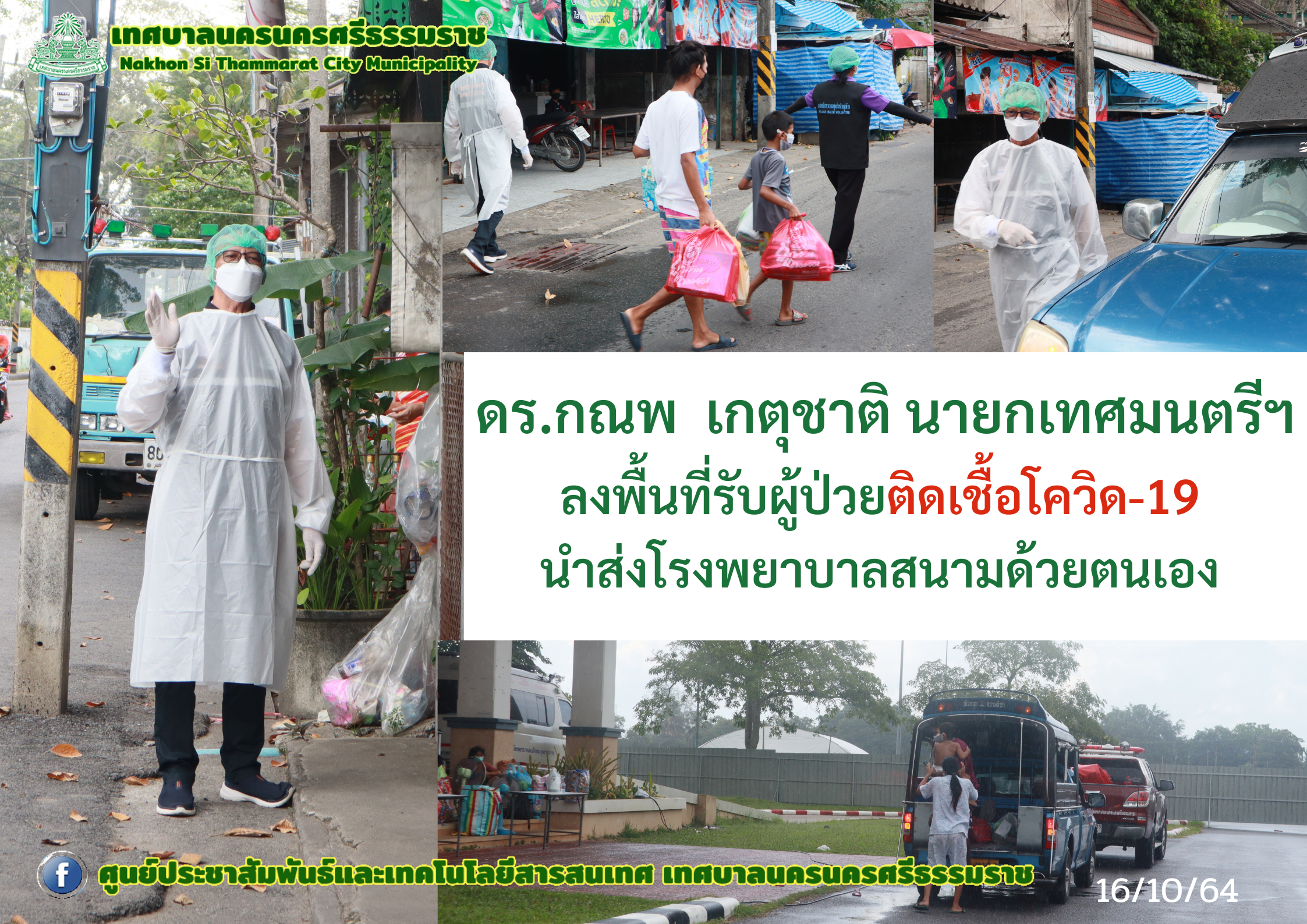 ดร.กณพ เกตุชาติ นายกเทศมนตรีนครนครศรีธรรมราช ลงพื้นที่ ติดตาม และรับผู้ป่วยติดเชื้อไวรัสโคโรนา 2019 ( covid -19 ) ในชุมชนพื้นที่ เขต 3 พร้อมนำส่งโรงพยาบาลสนามทุ่งท่าลาด |