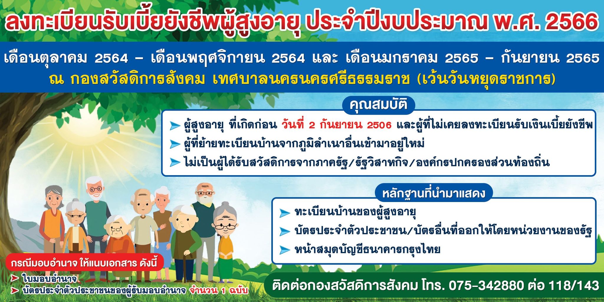 เทศบาลนครนครศรีธรรมราช เปิดรับลงทะเบียน รับเบี้ยยังชีพผู้สูงอายุ ปีงบประมาณ 2566 |