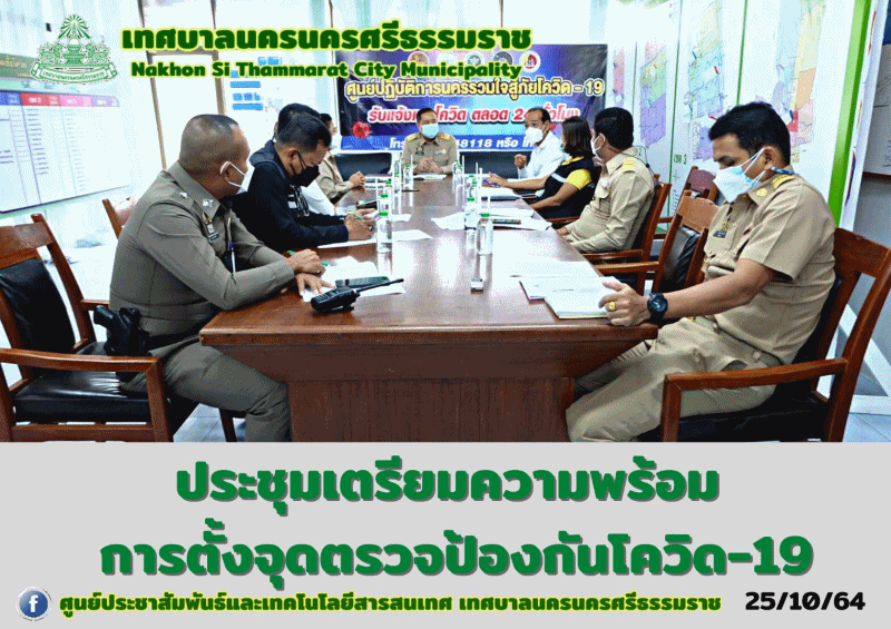 วันจันทร์ ที่25 ตุลาคม 2564 เวลา 11.00 น. ดร.กณพ เกตุชาติ นายกเทศมนตรีนครนครศรีธรรมราช มอบหมายให้ นายชาคร ไอศูรย์ ปลัดเทศบาล พร้อมด้วย นายยงยุทธ เหล่าเจริญเกียรติ หัวหน้างานป้องกันและบรรเทาสาธารณภัย และนายเศรษฐกุสุมภ์ชัย คงจันทร์ หัวหน้าฝ่ายรักษาความสงบ ร่วมประชุมเตรียมความพร้อมป้องกันโควิด-19 การจัดตั้งจุดตรวจ ด่านตรวจ ด่านลอย (เป็นเวลา) ชุดเคลื่อนที่เร็ว เพื่อคัดกรองคนเข้าเมือง |