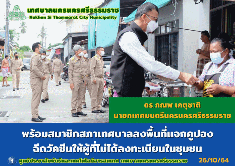 ดร.กณพ เกตุชาติ นายกเทศมนตรีนครนครศรีธรรมราช ลงพื้นที่แจกคูปองฉีดวัคซีนป้องกันโควิด-19 ให้ผู้ที่ไม่ได้ลงทะเบียนในชุมชน |