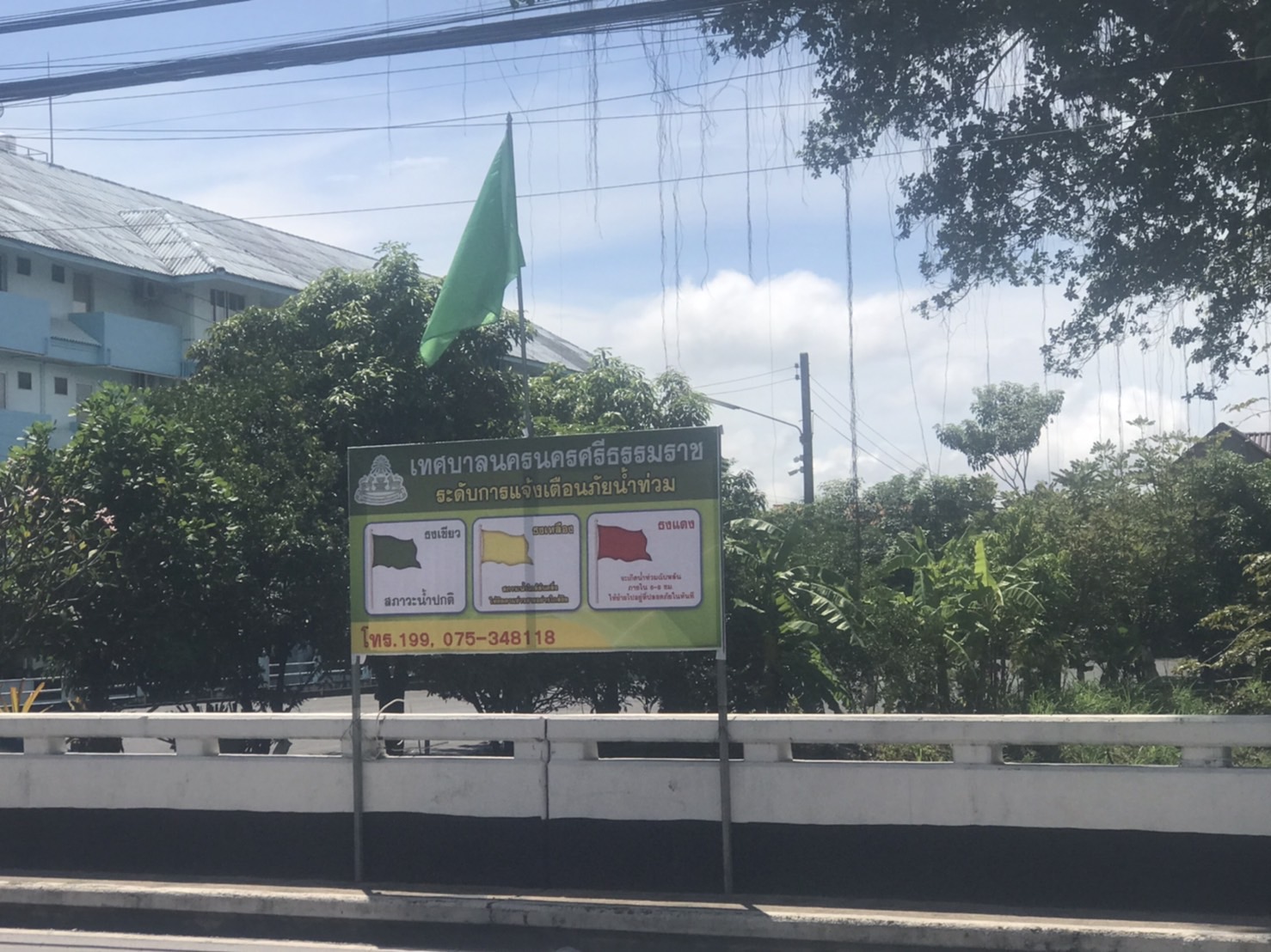 เทศบาลนครนครนครศรีธรรมราช เตรียมพร้อมรับสถานการณ์น้ำท่วมและน้ำล้นตลิ่ง ติดตั้งป้ายเตือนภัยพร้อมปักธงตามจุดต่าง ๆ ของลำคลองทุกสายที่ผ่านตัวเมืองนครศรีธรรมราช ขณะนี้ระดับน้ำยังอยู่ในเกณฑ์ปกติ ได้มีการปักธงสีเขียว |