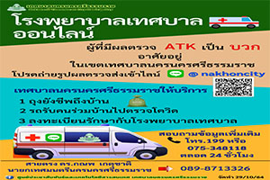 โรงพยาบาลเทศบาลออนไลน์ สำหรับผู้ที่มีผลตรวจ ATK เป็นบวก อาศัยอยู่ในเขตเทศบาลนครนครศรีธรรมราช โปรดถ่ายรูปผลตรวจส่งเข้าไลน์ @ Nakhoncity เทศบาลนครนครศรีธรรมราชให้บริการ 1 ถุงยังชีพถึงบ้าน 2 รถรับคนร่วมบ้านไปตรวจโควิด 3 ลงทะเบียนรักษากับโรงพยาบาลเทศบาล สอบถามข้อมูลเพิ่มเติม โทร.199 หรือ 075-348118 ตลอด 24 ชั่วโมง หรือ สายตรง ดร.กณพ เกตุชาติ นายกเทศมนตรีนครนครศรีธรรมราช 089-8713326