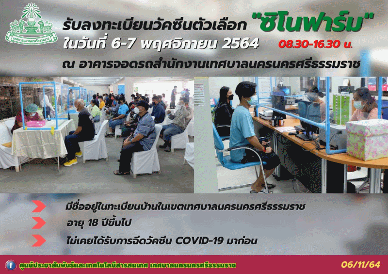 วันเสาร์ ที่6 พฤศจิกายน 2564 ดร.กณพ เกตุชาติ นายกเทศมนตรีนครนครศรีธรรมราช มอบหมายให้ เจ้าหน้าที่สำนักปลัดเทศบาล เจ้าหน้าที่ศูนย์ ICT สังกัดกองยุทธศาสตร์และงบประมาณ และเจ้าหน้าที่งานทะเบียนราษฎร์ รับลงทะเบียน และตรวจสอบข้อมูลสิทธิการได้รับวัคซีนตัวเลือก “ซิโนฟาร์ม” สามารถลงทะเบียนได้ภายในวันที่ 6-7 พฤศจิกายน 2564 เวลา 08.30 น.-16.30 น.ณ อาคารจอดรถเทศบาลนครนครศรีธรรมราช ทั้งนี้ผู้ที่สามารถลงทะเบียนได้ต้องมีคุณสมบัติ ดังนี้