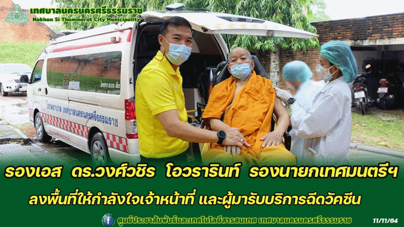 วันพฤหัสบดี ที่ 11 พฤศจิกายน 2564 เวลา 08.30 น. ณ ศูนย์OTOP นครศรีธรรมราช ดร.กณพ เกตุชาติ นายกเทศมนตรีนครนครศรีธรรมราช มอบหมายให้กองการแพทย์โรงพยาบาลเทศบาลนครนครศรีธรรมราช ดำเนินการฉีดวัคซีนป้องกันโควิด-19 และในวันนี้ ดร.วงศ์วชิร โอวรารินท์ รองนายกเทศมนตรีนครนครศรีธรรมราช พร้อมด้วยนายวีรศักดิ์ รับไทรทอง เลขานุการนายกเทศมนตรีนครนครศรีธรรมราช ลงพื้นที่ให้กำลังใจผู้ที่มาฉีดวัคซีนป้องกันโรคโควิด-19 |