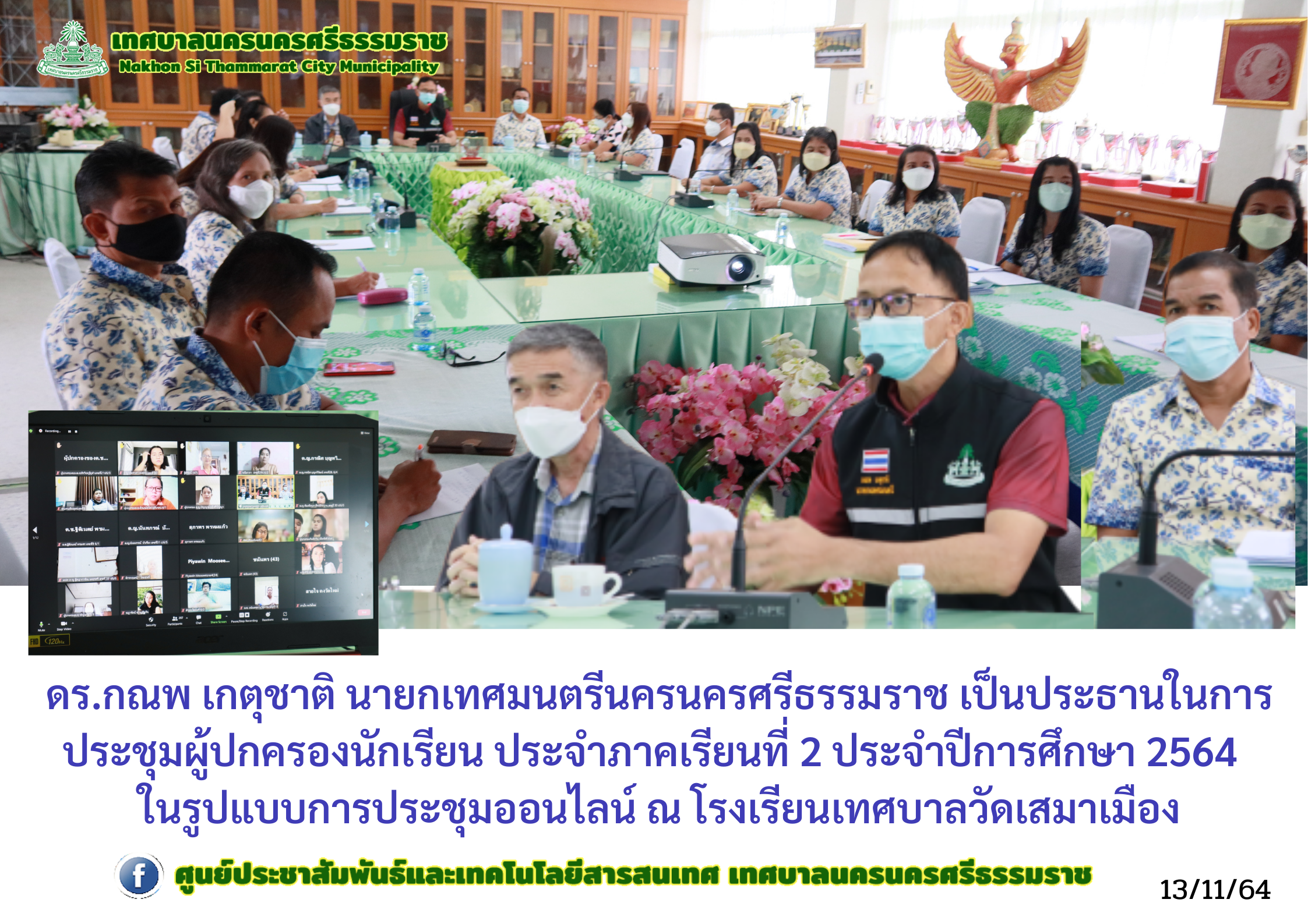 ดร.กณพ เกตุชาติ นายกเทศมนตรีนครนครศรีธรรมราช เป็นประธานในการประชุมผู้ปกครองนักเรียนประจำภาคเรียนที่ 2 ประจำปีการศึกษา 2564 ของนักเรียนระดับชั้นประถมศึกษาปีที่ 6 ในรูปแบบการประชุมออนไลน์ |