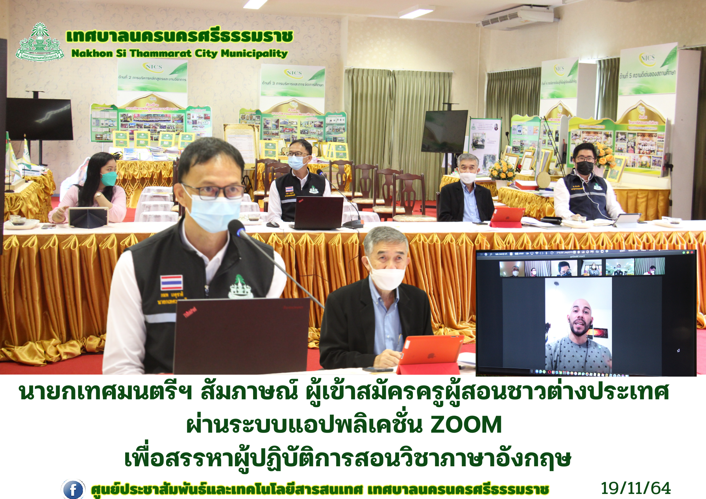 ดร.กณพ เกตุชาติ นายกเทศมนตรีนครนครศรีธรรมราช เป็นประธาน การสัมภาษณ์ ผู้เข้าสมัครครูผู้สอนชาวต่างประเทศ ผ่านระบบแอปพลิเคชั่น ZOOM เพื่อสรรหาผู้ปฏิบัติการสอนวิชาภาษาอังกฤษ |