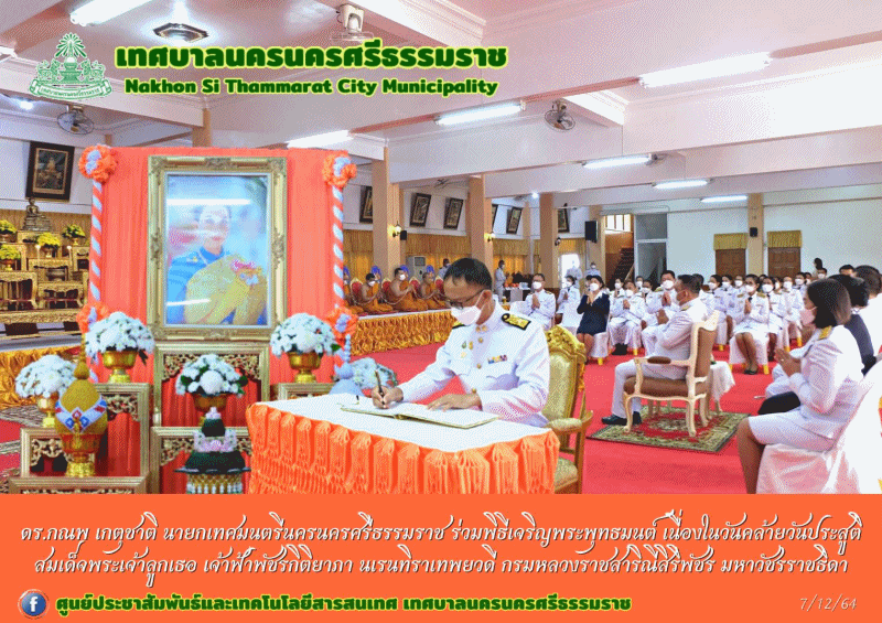 วันอังคาร ที่ 7 ธันวาคม 2564 ดร.กณพ เกตุชาติ นายกเทศมนตรีนครนครศรีธรรมราช ร่วมพิธีเจริญพระพุทธมนต์ เนื่องในวันคล้ายวันประสูติสมเด็จพระเจ้าลูกเธอ เจ้าฟ้าพัชรกิติยาภา นเรนทิราเทพยวดี กรมหลวงราชสาริณีสิริพัชร มหาวัชรราชธิดา โดยนำหน่วยงาน ภาครัฐ ภาคเอกชน ร่วมแสดงออกถึงความจงรักภักดี เพื่อให้ศาสนิกชนมีความรัก และเชิดชูสถาบันชาติ ศาสนา พระมหากษัตริย์ และน้อมรำลึกในพระมหากรุณาธิคุณ ถวายพระราชกุศล ณ ศาลา 100 ปี วัดพระมหาธาตุ วรมหาวิหาร อำเภอเมือง จังหวัดนครศรีธรรมราช โดยมี นายไกรศร วิศิษฎ์วงศ์ ผู้ว่าราชการจังหวัดนครศรีธรรมราช เป็นประธานในพิธี |