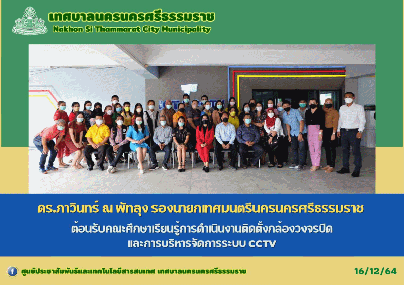 ดร.ภาวินทร์ ณ พัทลุง รองนายกเทศมนตรีนครนครศรีธรรมราช ต้อนรับคณะศึกษาเรียนรู้การดำเนินงานติดตั้งกล้องวงจรปิดและการบริหารจัดการระบบ CCTV |
