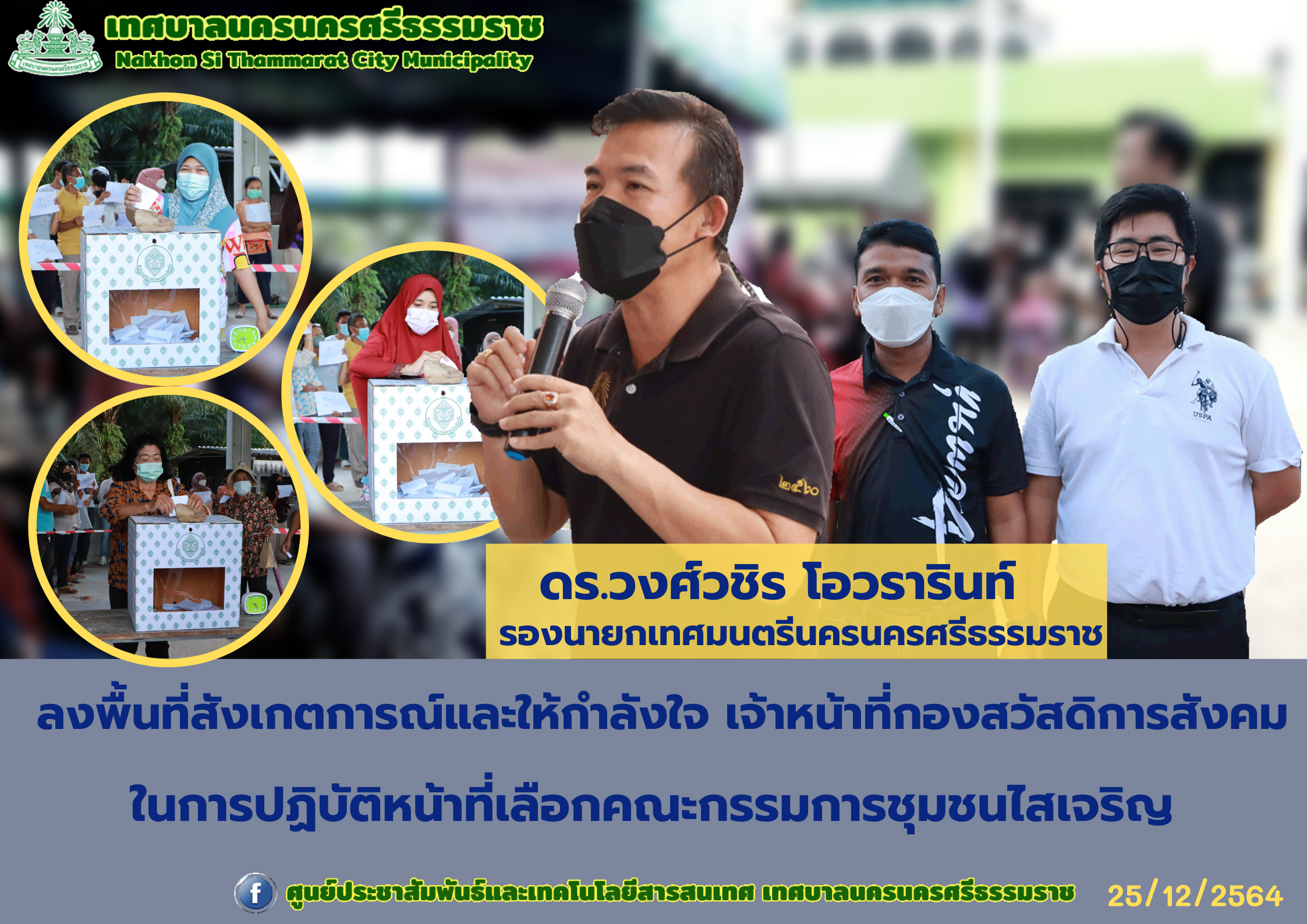เทศบาลนครนครศรีธรรมราช โดยกองสวัสดิการสังคม เลือกคณะกรรมการชุมชนไสเจริญ วันเสาร์ ที่ 25 ธันวาคม 2564 เวลา 16.00น .- 18.00 น. ณ มัสยิดกามาลุดดีน ดร.วงศ์วชิร โอวรารินท์ รองนายกเทศมนตรีนครนครศรีธรรมราช พร้อมด้วยเลขานุการนายกเทศมนตรี สมาชิกสภาเทศบาลนครนครศรีธรรมราชเขต 4 ลงพื้นที่สังเกตการณ์และให้กำลังใจเจ้าหน้าที่ในการเลือกคณะกรรมการชุมชนไสเจริญ ซึ่งจัดขึ้นระหว่างวันที่ 18-30 ธันวาคม 2564 จึงขอเชิญชวนที่อาศัยอยู่ในเขตชุมชน อายุ 18 ปีขึ้นไปให้มาใช้สิทธิเลือกคณะกรรมการชุมชนเทศบาลนครนครศรีธรรมราช โดยนำบัตรประชาชนมาด้วย ตามวันเวลาดังกล่าว และในที่ 30 ธันวาคม 2564 จะทำการเลือกประธาน รองประธาน เหรัญญิก เลขานุการ ฯลฯ เวลา 09.30 น. ณ ห้องประชุมเทศบาลนครนครศรีธรรมราช ชั้น5 |