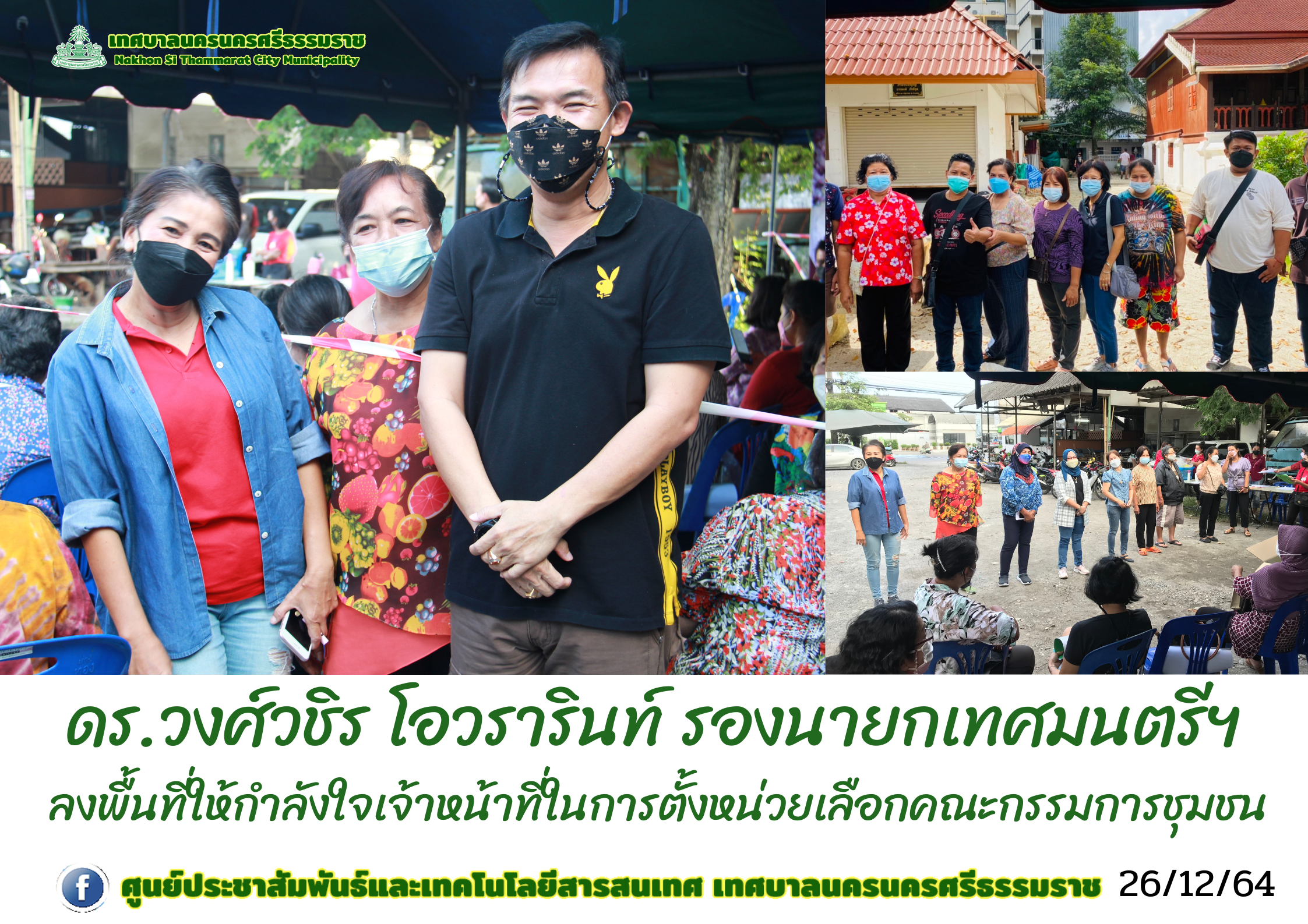 วันอาทิตย์ ที่ 26 ธันวาคม 2564 เวลา 09.00น. - 18.00 น. เทศบาลนครนครศรีธรรมราช โดยกองสวัสดิการสังคมดำเนินการตั้งหน่วยเลือกคณะกรรมการชุมชนเทศบาลนครนครศรีธรรมราช ณ ชุมชนหน้าทักษิณ และชุมชนเศรษฐีศรีนคร