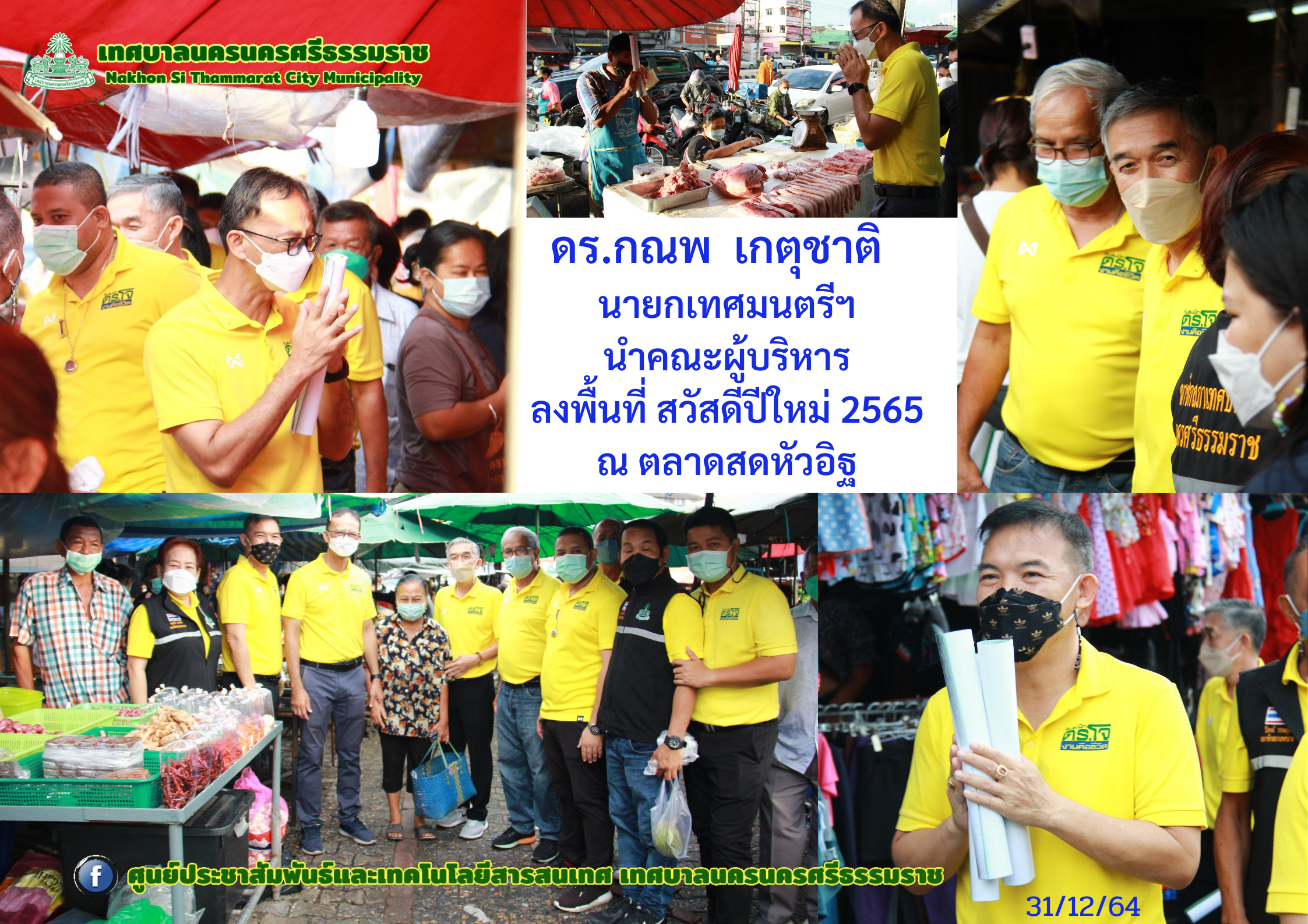 วันศุกร์ ที่ 31 ธันวาคม 2564 เวลา 07.30 น. ดร.กณพ เกตุชาติ นายกเทศมนตรีนครนครศรีธรรมราช นำคณะผู้บริหาร สมาชิกสภาเทศบาลนครนครศรีธรรมราช ลงพื้นที่ สวัสดีปีใหม่ 2565 มอบปฏิทินเทศบาลนครนครศรีธรรมราช ให้แก้ พ่อค้า แม่ค้า ผู้ประกอบการ และประชาชนผู้ใช้บริการตลาดสดหัวอิฐ