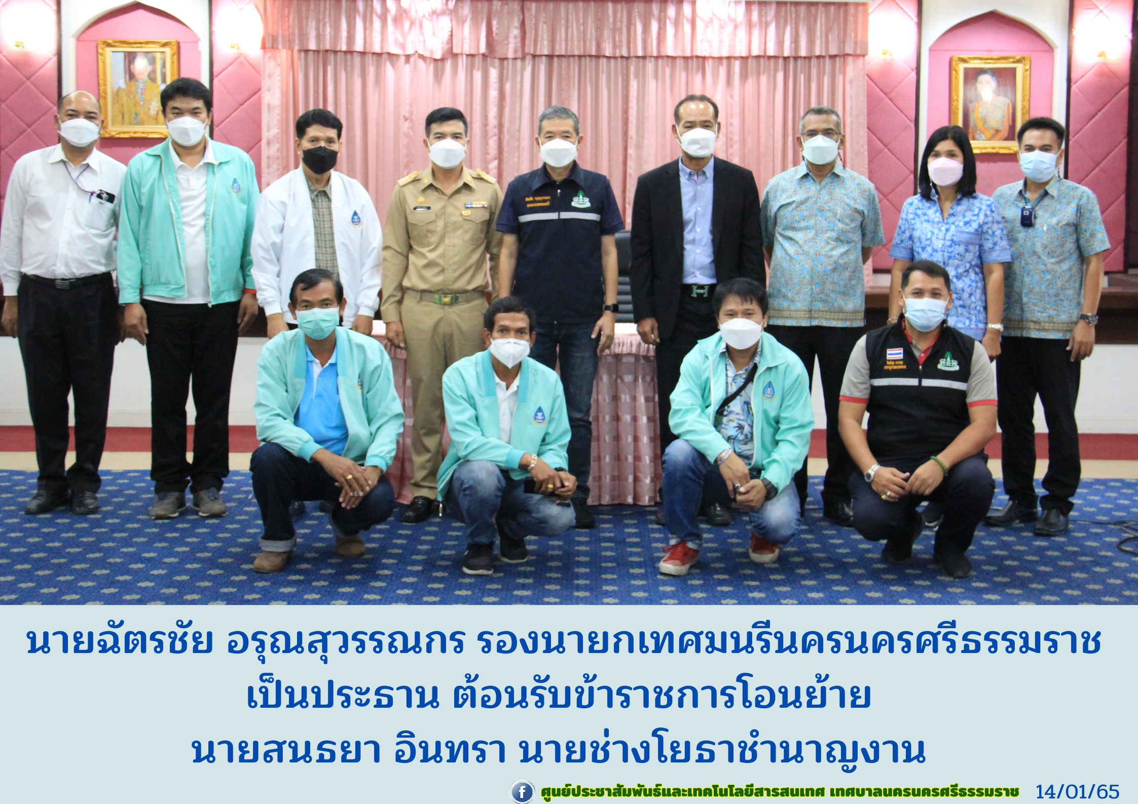 วันศุกร์ ที่ 14 มกราคม 2564 เวลา 10.30 น. ณ ห้องประชุมชั้น 5 สำนักงานเทศบาลนครนครศรีธรรมราช นายฉัตรชัย อรุณสุวรรณกร รองนายกเทศมนรีนครนครศรีธรรมราช เป็นประธาน ต้อนรับข้าราชการโอนย้าย นายสนธยา อินทรา นายช่างโยธาชำนาญงาน จาก กรุงเทพมหานคร มารับตำแหน่งฝ่ายสาธารณูปโภค ส่วนการโยธา สำนักการช่าง เทศบาลนครนครศรีธรรมราช