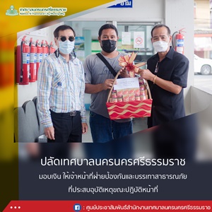 ปลัดเทศบาลนครนครศรีธรรมราชมอบเงิน ให้เจ้าหน้าที่ฝ่ายป้องกันและบรรเทาสาธารณภัยที่ประสบอุบัติเหตุขณะปฎิบัติหน้าที่ |