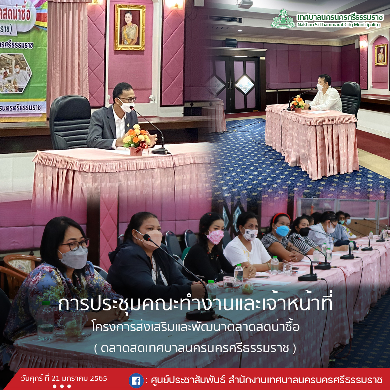 วันศุกร์ที่ 21 มกราคม 2565 เวลา 13.00 น. ณ ห้องประชุมชั้น 5 สำนักงานเทศบาลนครนครศรีธรรมราช ดร.กณพ เกตุชาติ นายกเทศมนตรีนครนครศรีธรรมราช มอบหมายให้ ดร.วงศ์วชิร โอวรารินท์ รองนายกเทศมนตรีฯ เป็นประธาน ในโครงการส่งเสริมและพัฒนาตลาดสดน่าซื้อ (ตลาดสดเทศบาลนครนครศรีธรรมราช) พร้อมด้วย นางบุญตา ถาวรมงคล นักวิชาการสุขาภิบาลชำนาญการ เจ้าหน้าที่กองสาธารณสุขและสิ่งแวดล้อม เข้าร่วม เพื่อเข้ารับการอบรมมาตรฐานสุขาภิบาลและการดำเนินการตลาด พร้อมร่วมหารือเรื่องการบริหารจัดการสิ่งอำนวยความสะดวกให้พร้อมช่วงเทศกาลตรุษจีน ทั้งนี้ เพื่อให้ตลาดดำเนินการไปตามมาตรการการป้องกันการแพร่ระบาดของโรคติดเชื้อไวรัสโคโรนา 2019 หรือโควิด-19 ภาพ ข่าว // อรชุมา ภาพ // เจ้าหน้าที่กองสาธารณสุขและสิ่งแวดล้อม ภาพอินโฟฯ วิศรุต // (นักศึกษาฝึกงาน) ตรวจทาน // อารีรัตน์ |