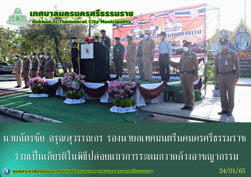 นายฉัตรชัย อรุณสุวรรณกร รองนายกเทศมนตรีนครนครศรีธรรมราช ร่วมเป็นเกียรติในพิธีปล่อยแถวการระดมกวาดล้างอาชญากรรม |