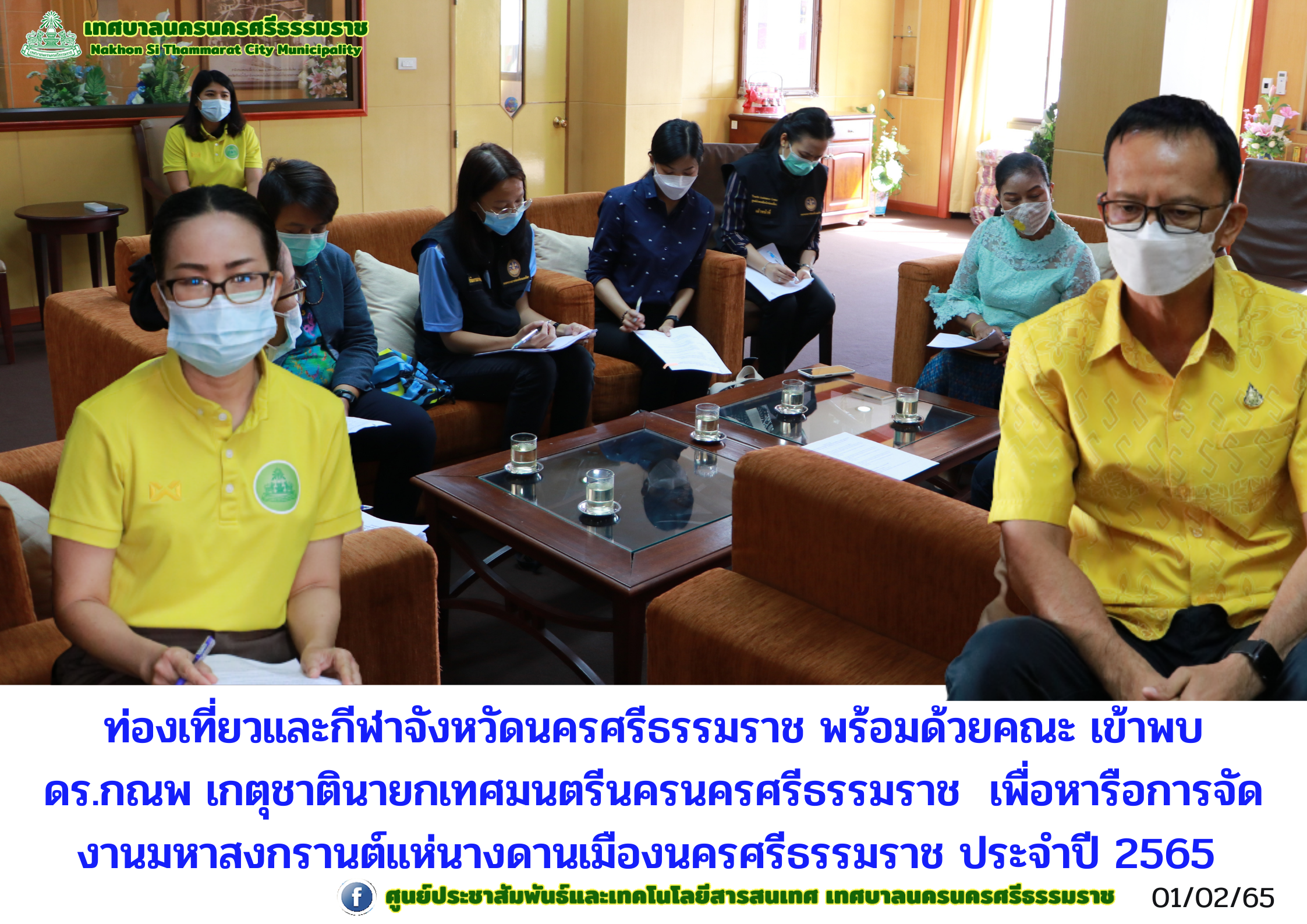 ท่องเที่ยวและกีฬาจังหวัดนครศรีธรรมราช พร้อมด้วยคณะ เข้าพบ ดร.กณพ เกตุชาติ นายกเทศมนตรีนครนครศรีธรรมราช เพื่อหารือการจัดงานมหาสงกรานต์แห่นางดานเมืองนครศรีธรรมราช ประจำปี 2565 |