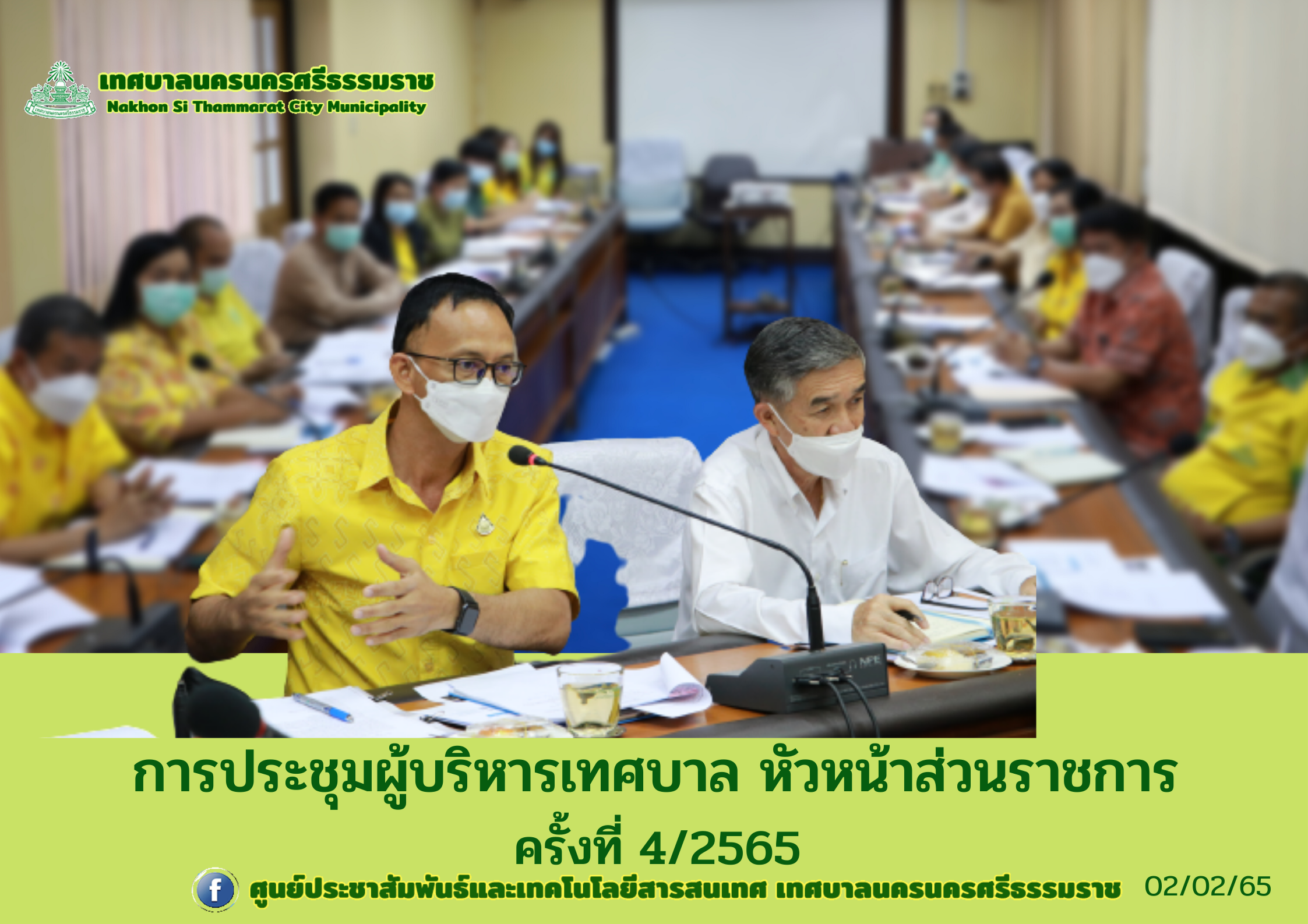 วันพุธ ที่ 2 กุมภาพันธ์ พ.ศ. 2565 เวลา 10.00. น. ห้องประชุมชั้น 2 สำนักงานเทศบาลนคร ดร.กณพ เกตุชาติ นายกเทศมนตรีนครนครศรีธรรมราช เป็นประธานการประชุมผู้บริหารเทศบาล หัวหน้าส่วนราชการ ครั้งที่ 4/2565 เพื่อติดตามผลการปฎิบัติราชการ ดังนี้