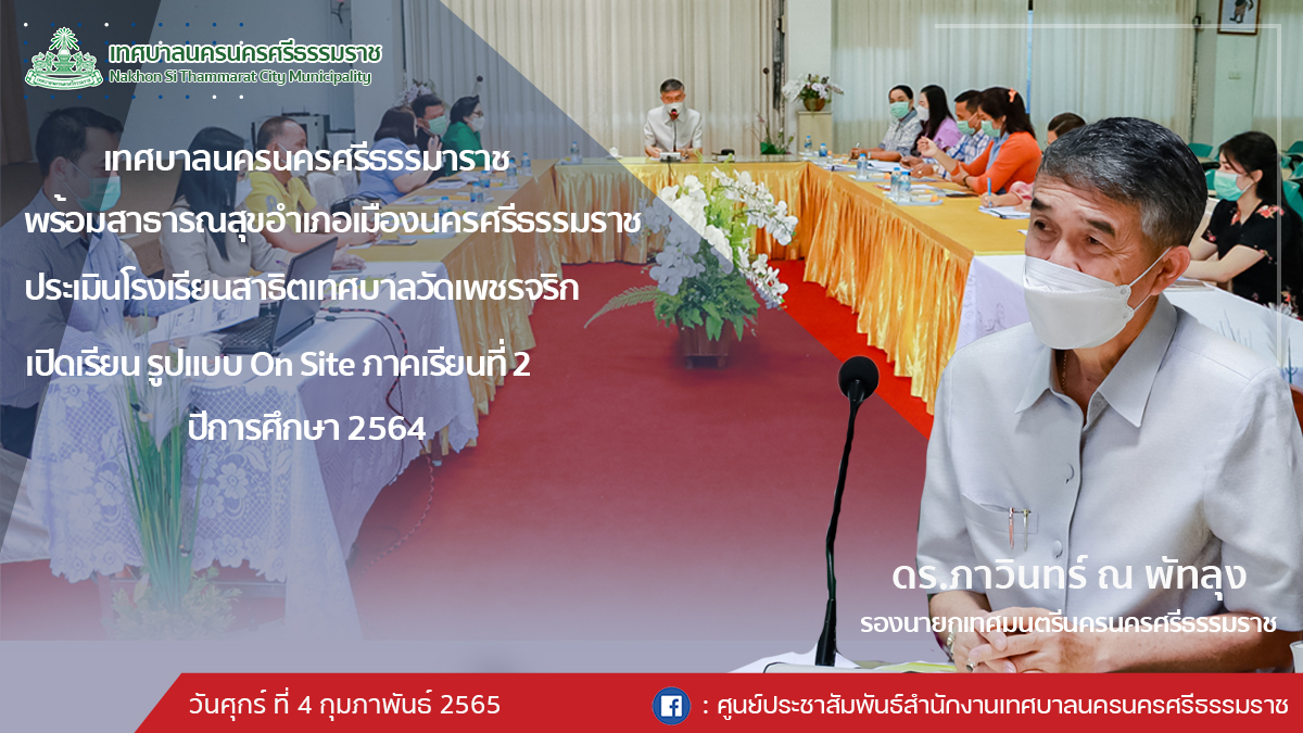วันศุกร์ที่ 4 กุมภาพันธ์ พ.ศ. 2565 ตั้งแต่เวลา 08.30 น. นายภาวินทร์ ณ พัทลุง รองนายกเทศมนตรีนครนครศรีธรรมราช พร้อมด้วยคณะผู้บริหารสถานศึกษา ลงพื้นที่ การประเมินสถานศึกษาเพื่อเปิดเรียน รูปแบบ On Site ภาคเรียนที่ 2 ปีการศึกษา 2564 ของสถานศึกษาในสังกัดเทศบาลนครนครศรีธรรมราช ร่วมกับ นายวินัย วาหลวง สาธารณสุขอำเภอเมืองนครศรีธรรมราช และคณะ ลงพื้นที่ประเมิน โรงเรียนสาธิตเทศบาลวัดเพชรจริก