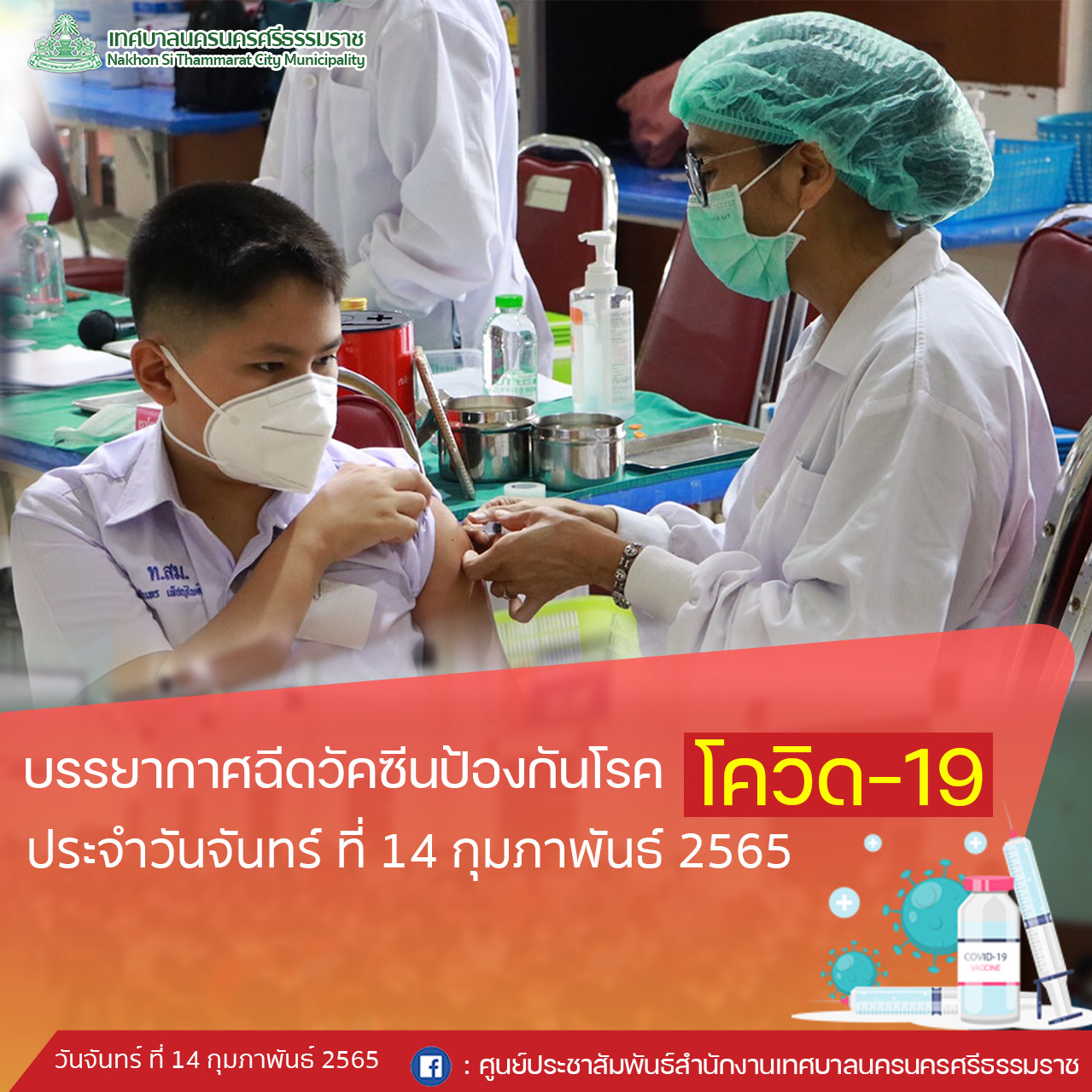 วันจันทร์ ที่ 14 กุมภาพันธ์ 2565 เวลา 08.30 น. ณ หอประชุมเมือง (ทุ่งท่าลาด) ดร.กณพ เกตุชาติ นายกเทศมนตรีนครนครศรีธรรมราช มอบหมายให้กองการแพทย์โรงพยาบาลเทศบาลนครนครศรีธรรมราชดำเนินการฉีดวัคซีนป้องกันโควิด-19 สำหรับนักเรียน อายุ 5-11 ปี ซึ่งบรรยากาศเป็นไปด้วยความเรียบร้อย มีการเว้นระยะห่างเพื่อความปลอดภัยสำหรับผู้ที่มารอฉีดวัคซีน และมีการตรวจคัดกรองก่อนที่จะเข้ารับการฉีดวัคซีนอย่างเข้มข้น สอบถามเพิ่มเติมได้ที่ 075-356014 ต่อ 0 – 088-2620737, 088-2620738 ในวันและเวลาราชการ ตั้งแต่เวลา 08.30 น.-15.30 น.